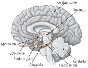 The pituitary gland is a pea-sized structure that is attached to the undersurface of the brain by a thin stalk. It is protected by a cradle of bone called the sella turcica, which is located above the nasal passages, almost directly behind the eyes. The pituitary gland sometimes is called the master gland because it produces hormones that regulate many bodily functions, including the production of: